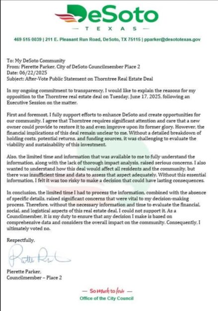 “I fully support efforts to enhance DeSoto and create opportunities for our community,” Parker wrote. “I agree that ThornTree requires significant attention and care that a new owner could provide. However, the financial implications of this deal remain unclear to me.”